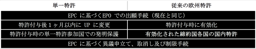 第 1 図が示す様に、単一特許と欧州特許の出願過程は全く同じです。単一特許制度の下では、出願人は全参加国に適用のある単一特許を選択し、更に、単一特許制度外の国々で特許を有効化することができます。