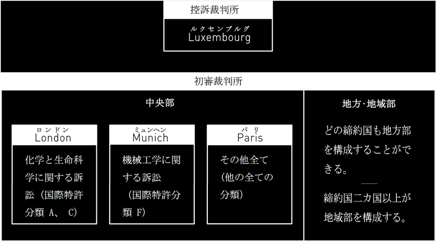 UPC は、初審裁判所と控訴裁判所で構成されます。初審裁判所は中央部の ロンドン、ミュンヘン、パリ と地方•地域部に設置されます。控訴裁判所は ルクセンブルグ に設置されます。